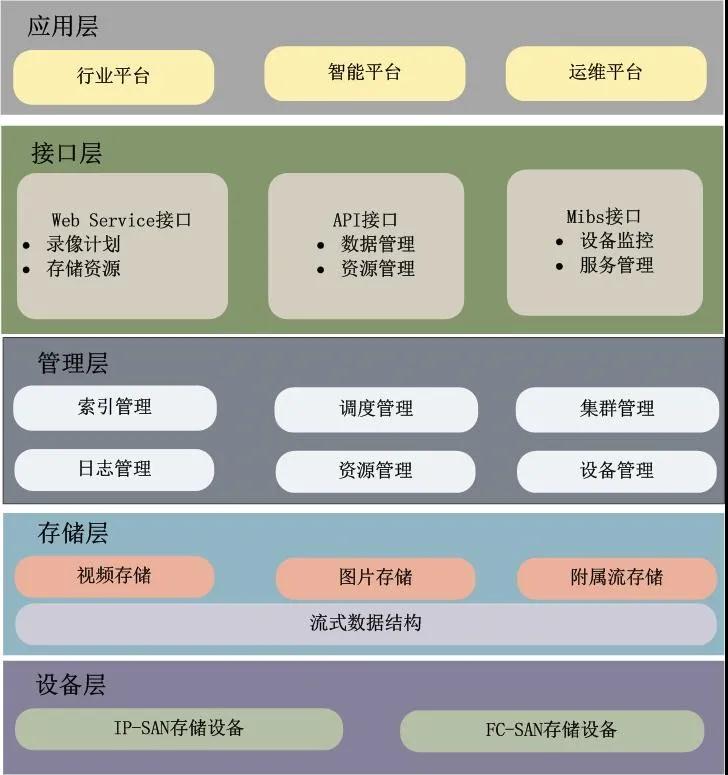 應(yīng)用接口層是云存儲(chǔ)最靈活多變的部分,接口層面向用戶應(yīng)用提供完善以及統(tǒng)一的訪問接口,接口類型可分為Web Service接口、API接口、Mibs接口,可以根據(jù)實(shí)際業(yè)務(wù)類型,開發(fā)不同的應(yīng)用服務(wù)接口,提供不同的應(yīng)用服務(wù)。實(shí)現(xiàn)和行業(yè)專屬平臺(tái)、運(yùn)維平臺(tái)的對(duì)接;實(shí)現(xiàn)和智能分析處理系統(tǒng)之間的對(duì)接;實(shí)現(xiàn)視頻數(shù)據(jù)的存儲(chǔ)、檢索、回放、瀏覽轉(zhuǎn)發(fā)等操作;實(shí)現(xiàn)關(guān)鍵視頻數(shù)據(jù)的遠(yuǎn)程容災(zāi);實(shí)現(xiàn)設(shè)備以及服務(wù)的監(jiān)控和運(yùn)維等。